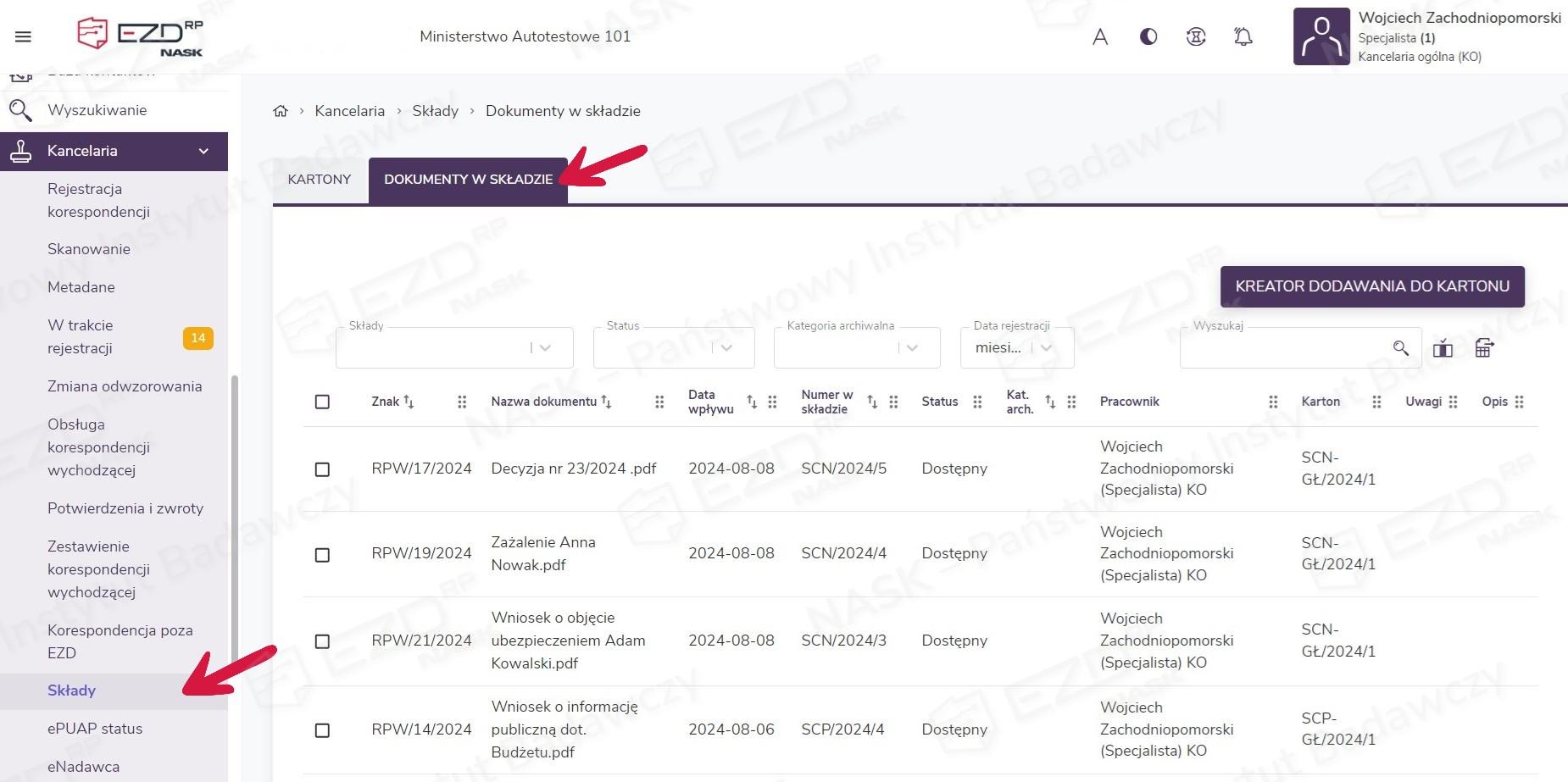 Aby przejść do obsługi dokumentów w składzie chronologicznym, w pierwszym kroku należy kliknąć w menu głównym sekcję Kancelaria > Składy, a następnie wybrać zakładkę Dokumenty w składzie. Po jej kliknięciu zostanie wyświetlona lista wszystkich zarejestrowanych dokumentów.