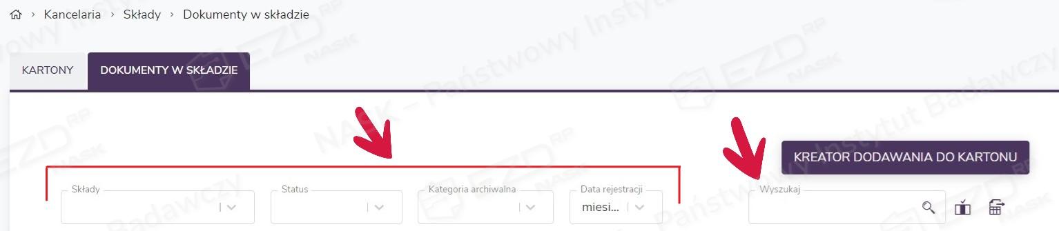 Użytkownik ma możliwość filtrowania pozycji na liście za pomocą pól: Składy, Status, Kategoria archiwalna, Data rejestracji. Możliwe jest też wyszukiwanie konkretnych dokumentów przy użyciu pola Wyszukaj z ikoną lupy.