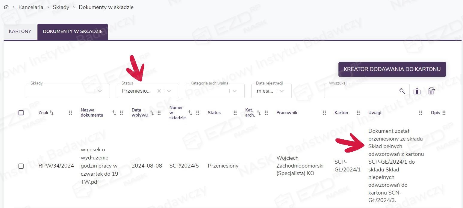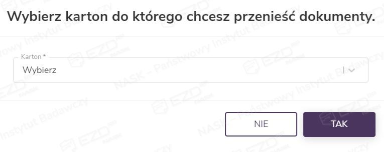 Jeżeli dokument jest już przyporządkowany do kartonu i chcemy przenieść go do innego w ramach tego samego składu, należy wybrać opcję Przenieś do innego kartonu.