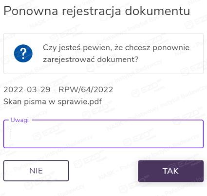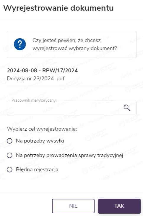 Dokumenty ze statusem Dostępny można wyrejestrować ze składu. Po kliknięciu opcji Wyrejestruj, wprowadzeniu danych w wyświetlonym panelu bocznym i zatwierdzeniu czynności przyciskiem Tak dokument zmienia status na Wyrejestrowany.