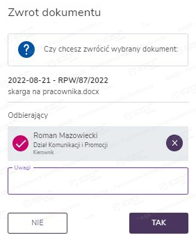 Po zaznaczeniu pola wyboru przy dokumencie ze statusem Wypożyczony w menu kontekstowym mamy do wyboru opcje: Wydrukuj etykietę, Historia oraz Zwróć. Ostatnia z wymienionych funkcji pozwala na przyjęcie wcześniej wypożyczonych dokumentów do składu chronologicznego. Po jej kliknięciu, wprowadzeniu danych w wyświetlonym panelu bocznym i zatwierdzeniu czynności przyciskiem Tak dokument uzyskuje ponownie status Dostępny.