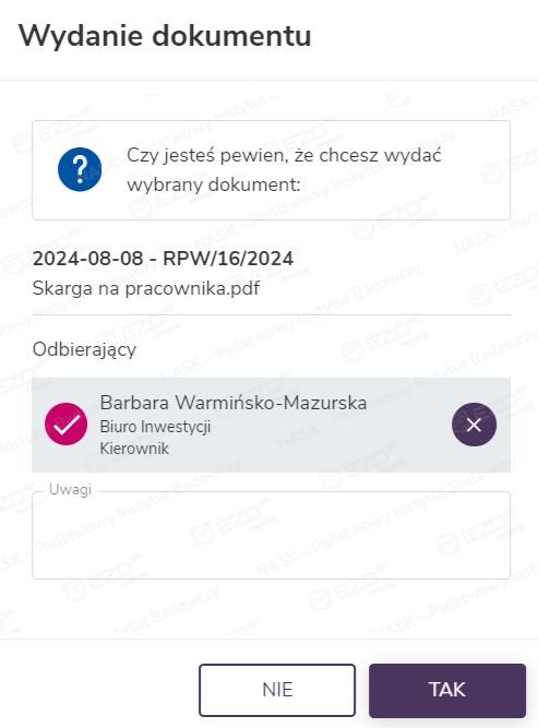 Po zaznaczeniu pola wyboru przy dokumencie ze statusem Gotowy do odbioru w menu kontekstowym mamy do wyboru opcje: Edytuj opis, Historia, Wydrukuj etykietę oraz Wydanie. Ostatnia z wymienionych funkcji pozwala na wydanie dokumentu przygotowanego do wypożyczenia lub wyrejestrowania ze składu. Po kliknięciu tej opcji, wprowadzeniu danych w wyświetlonym panelu bocznym i zatwierdzeniu czynności przyciskiem Tak dokument uzyskuje status Wypożyczony lub Wyrejestrowany.