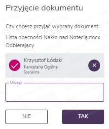 Po zaznaczeniu pola wyboru przy dokumencie ze statusem Oczekuje na przyjęcie w menu kontekstowym mamy do wyboru opcje Historia oraz Przyjęcie dokumentu, która pozwala na przyjęcie dokumentu do składu. Po kliknięciu tej funkcji, wprowadzeniu danych w wyświetlonym panelu bocznym i zatwierdzeniu czynności przyciskiem Tak dokument uzyskuje status Dostępny.