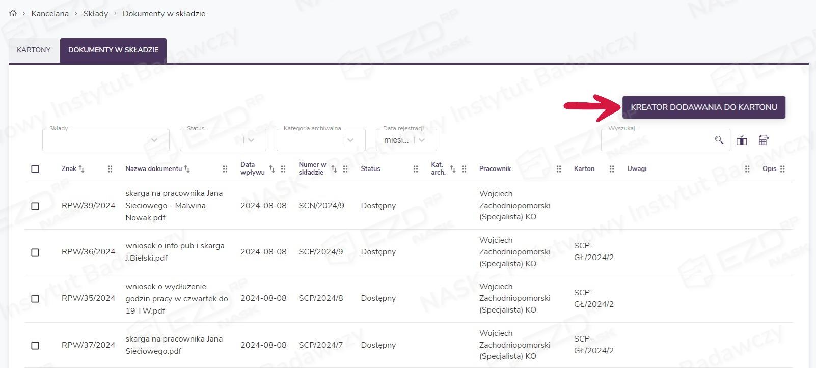 W prawym górnym rogu w widoku zakładki Dokumenty w składzie dostępny jest przycisk Kreator dodawania do kartonu. Umożliwia on hurtowe przyporządkowywanie dokumentów do kartonów. Funkcja ta jest przeznaczona dla użytkowników, którzy zdecydowali się na wyłączenie domyślnej rejestracji dokumentów w kartonach.