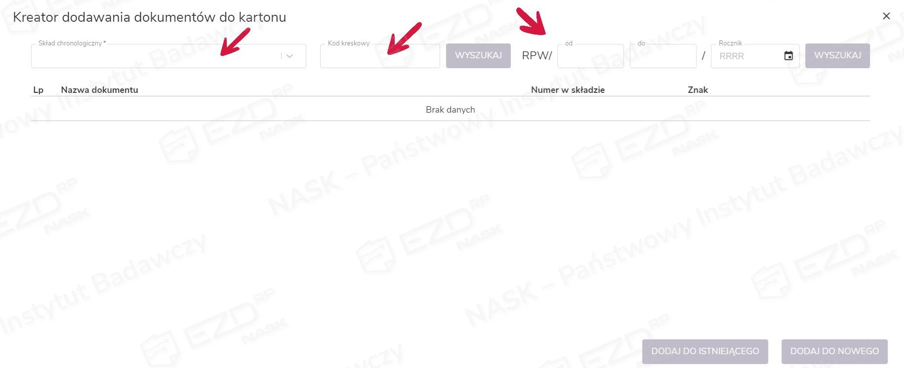 Po kliknięciu przycisku Kreator dodawania do kartonu otwiera się okno Kreator dodawania dokumentów do kartonu. W pierwszej kolejności w polu Skład chronologiczny należy wybrać skład, z którego dokumenty będziemy przypisywać do kartonu. Następnie można wczytać kod kreskowy lub w polach Od i Do wpisać zakres numerów RPW dokumentów, które użytkownik chce umieścić na liście. W ostatnim kroku należy uzupełnić pole Rocznik.