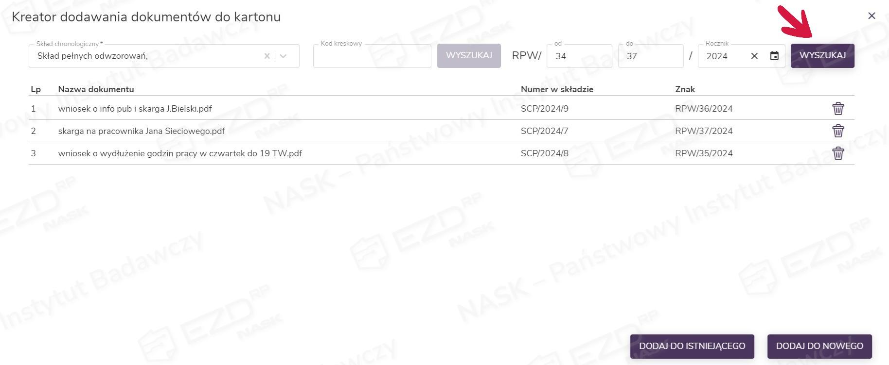 Poniżej wykazu widoczne są dwie opcje dodawania dokumentów do kartonu – Dodaj do istniejącego i Dodaj do nowego. Funkcja Dodaj do istniejącego spowoduje dodanie dokumentów do aktualnie otwartego kartonu. Z kolei opcja Dodaj do nowego otworzy nowy karton i przyporządkuje do niego dokumenty z listy.