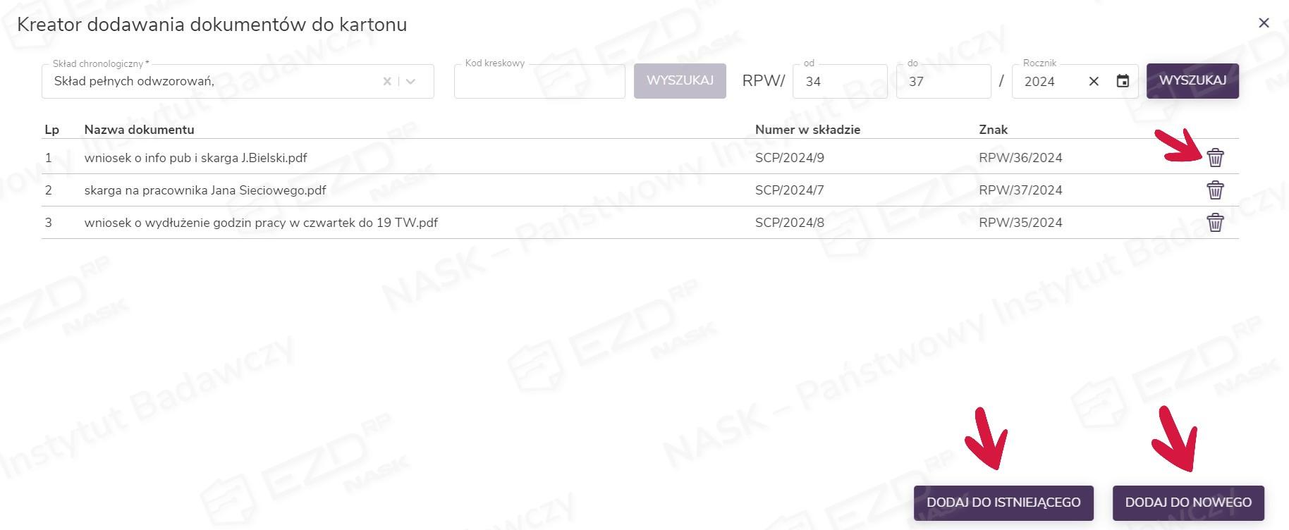Przycisk z ikoną kosza służy do usuwania dokumentów z listy.