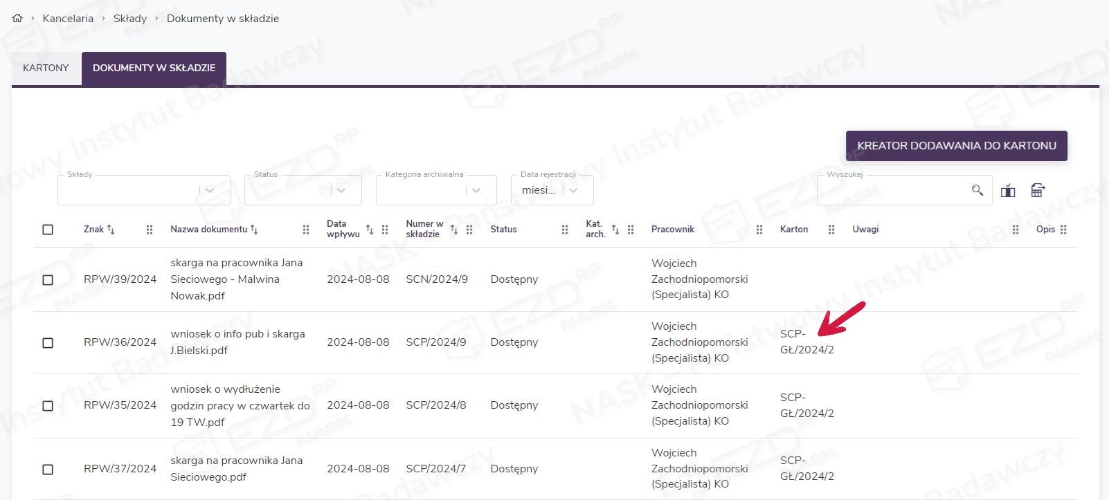 Po wybraniu jednej z dwóch funkcji system umieści wskazane dokumenty w kartonie. W kolumnie Karton pojawi się informacja, w jakim kartonie się one znajdują.