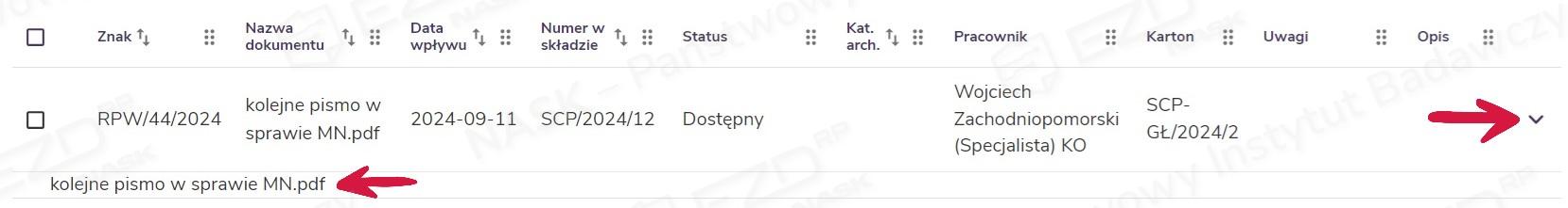 Jeśli dokumenty zostały zeskanowane, można je w tym miejscu wyświetlić. W tym celu wystarczy rozwinąć strzałkę znajdującą się po prawej stronie i kliknąć tytuł dokumentu.