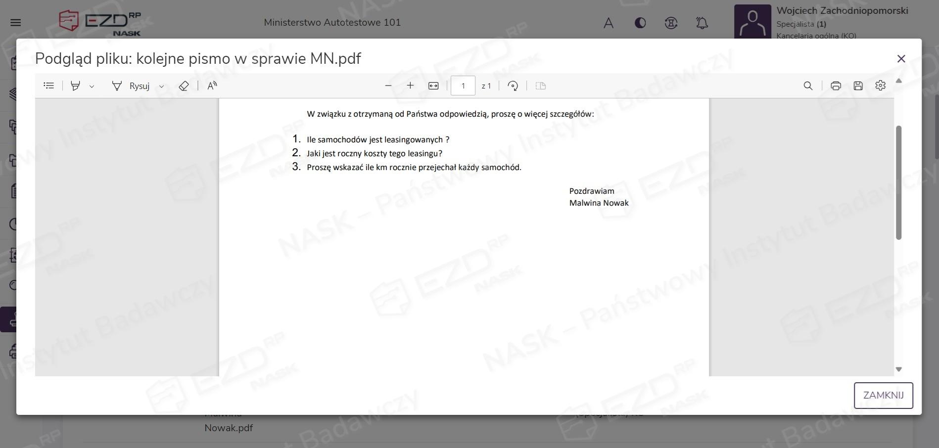 W przypadku dokumentów ze statusem Dostępny w prawym menu mamy do wyboru pięć opcji.