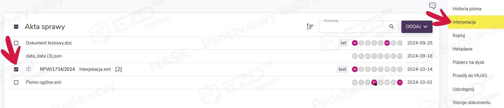 W celu obsłużenia interpelacji po wejściu do sprawy w jej aktach należy zaznaczyć odpowiedni plik XML z nadanym numerem wpływu i z menu kontekstowego wybrać opcję Interpelacja.