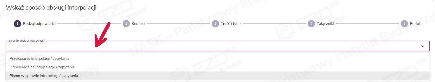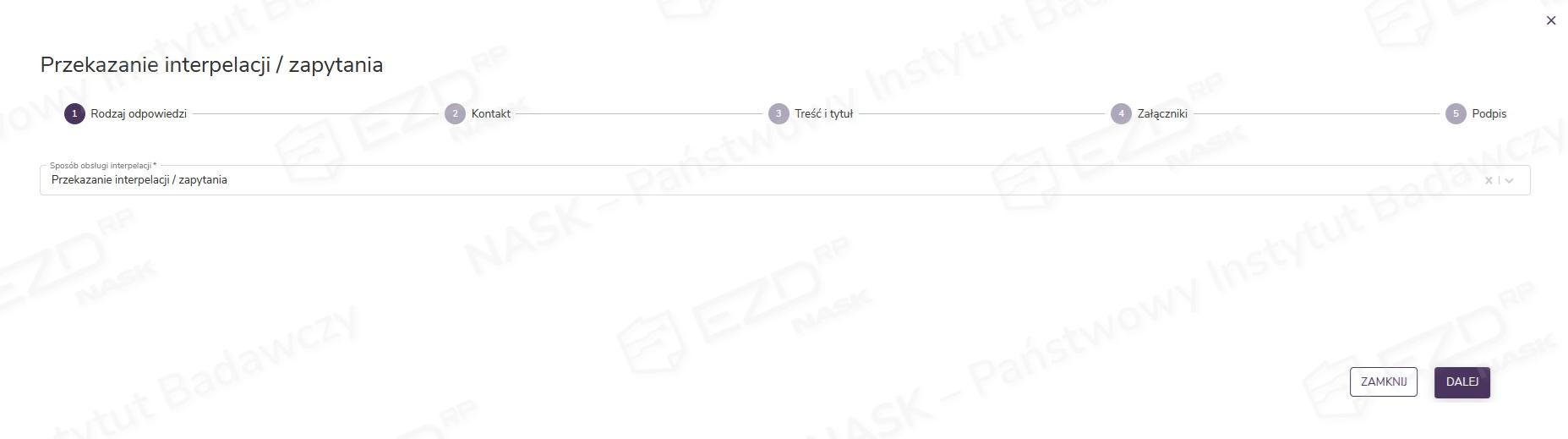 Użytkownik zostanie wówczas przeniesiony do widoku tworzenia koperty XML dla odpowiedzi na interpelację. W wyświetlonym oknie w pierwszym kroku należy wybrać sposób obsługi interpelacji.