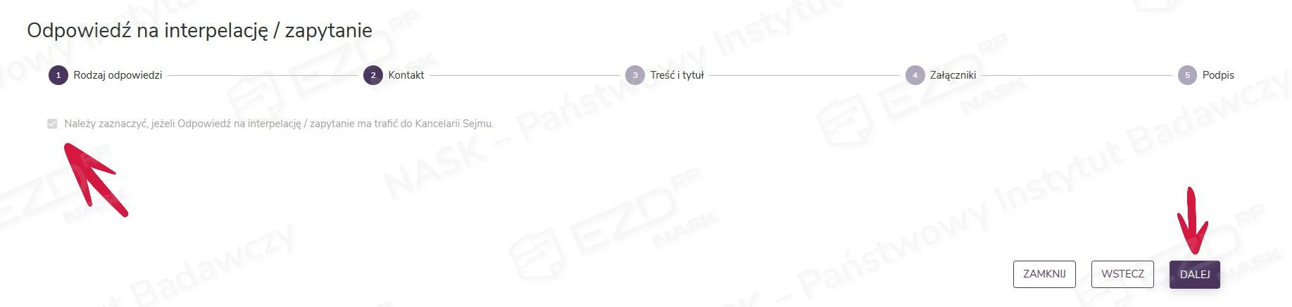 Po wybraniu opcji Odpowiedź na interpelację/zapytanie i kliknięciu przycisku Dalej użytkownik jest przenoszony do kroku drugiego – Kontakt. W tym oknie znajduje się pole wyboru z komunikatem o treści: Należy zaznaczyć, jeżeli Odpowiedź na interpelację / zapytanie ma trafić do Kancelarii Sejmu. Pole to jest jednak nieaktywne, co oznacza brak możliwości zmiany odbiorcy odpowiedzi. Użytkownik wybiera opcję Dalej.
