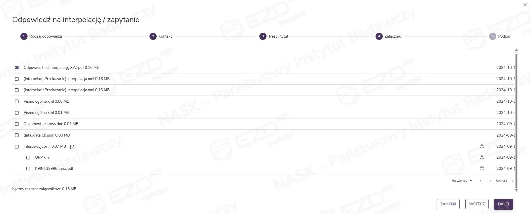 W czwartym kroku należy wskazać załącznik bądź załączniki, które ma zawierać odpowiedź (analogicznie jak w widoku tworzenia ePisma).