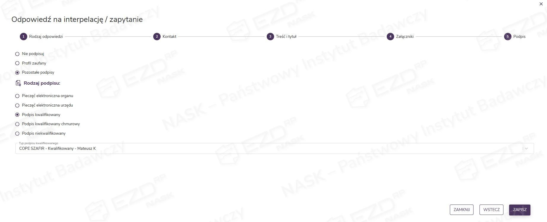 Kolejne kroki są takie same jak w przypadku odpowiedzi na interpelację – a więc użytkownik musi wskazać załączniki, które mają zostać przekazane, oraz podpisać przygotowaną kopertę XML lub na tym etapie pominąć podpisywanie.