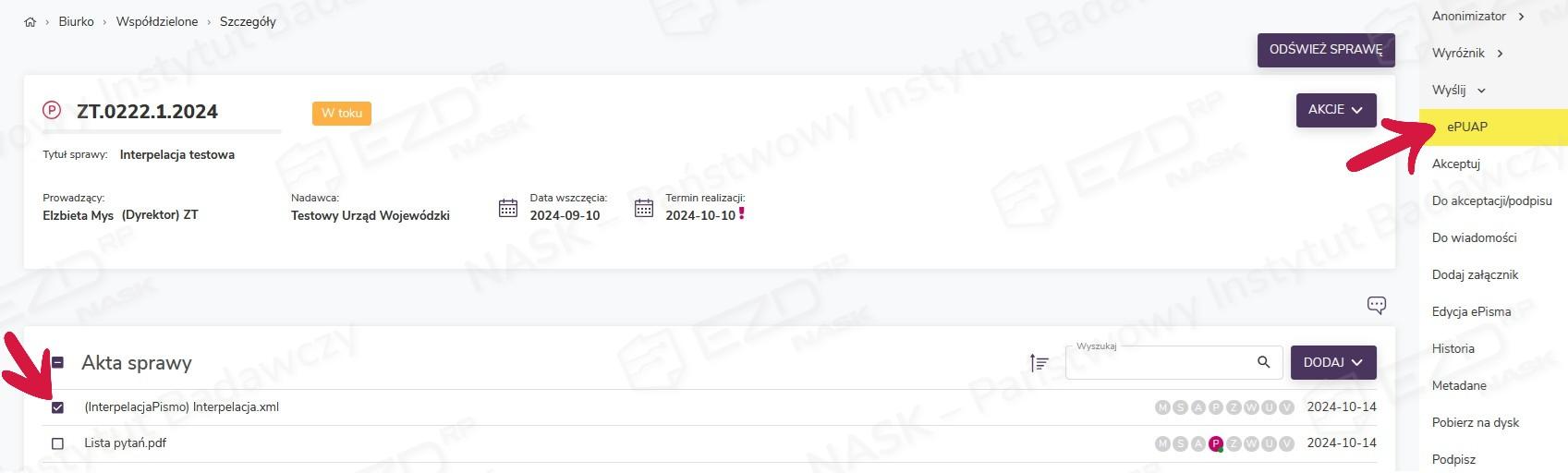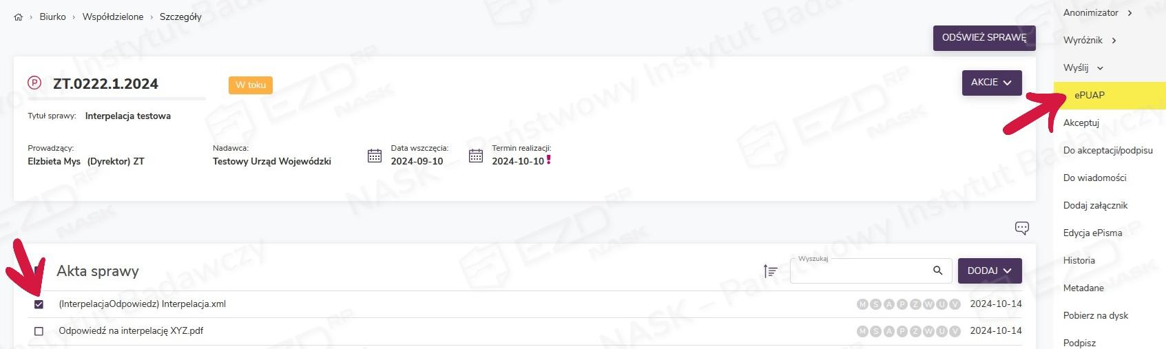 Po zapisaniu utworzona koperta XML widoczna jest w Aktach sprawy z dopiskiem InterpelacjaPismo. Plik po podpisaniu można wysłać do właściwego podmiotu, wybierając z menu kontekstowego opcję Wyślij > ePUAP.