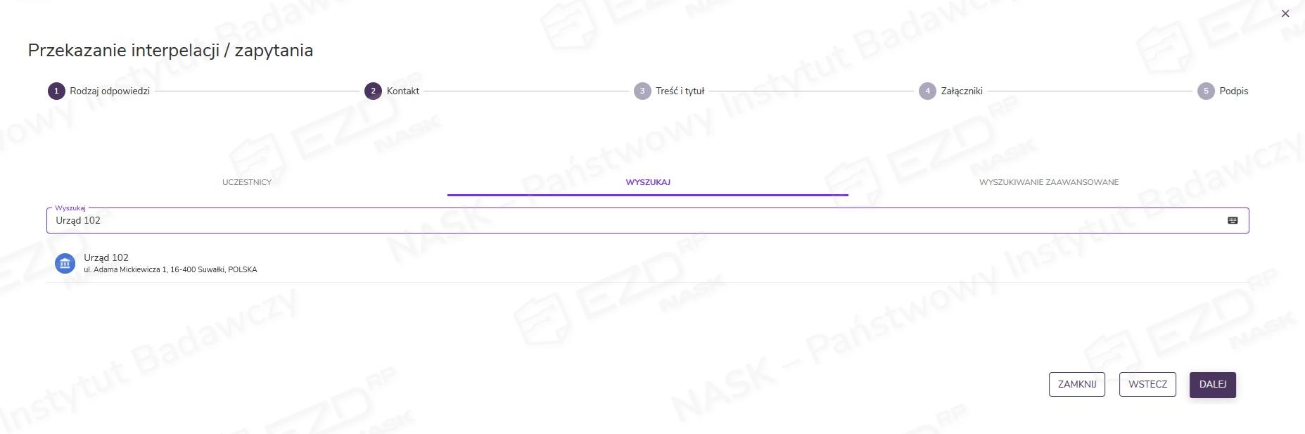 W celu przesłania interpelacji do innego, właściwego organu użytkownik wybiera jako sposób jej obsługi opcję Przekazanie interpelacji/zapytania. W kroku drugim możliwe jest wskazanie odbiorcy – instytucji z Bazy kontaktów znajdującej się w systemie.