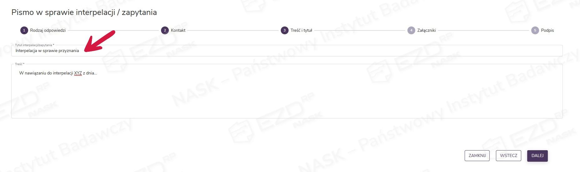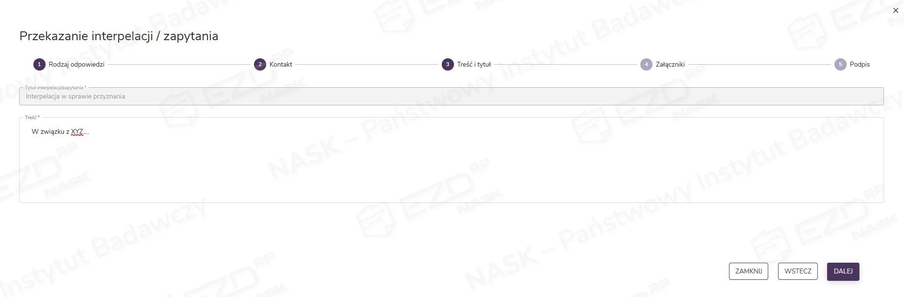 Po wybraniu kontaktu w następnym kroku konieczne jest wpisanie tytułu interpelacji (inaczej niż przy pozostałych rodzajach odpowiedzi) oraz uzupełnienie treści przygotowywanej koperty XML.