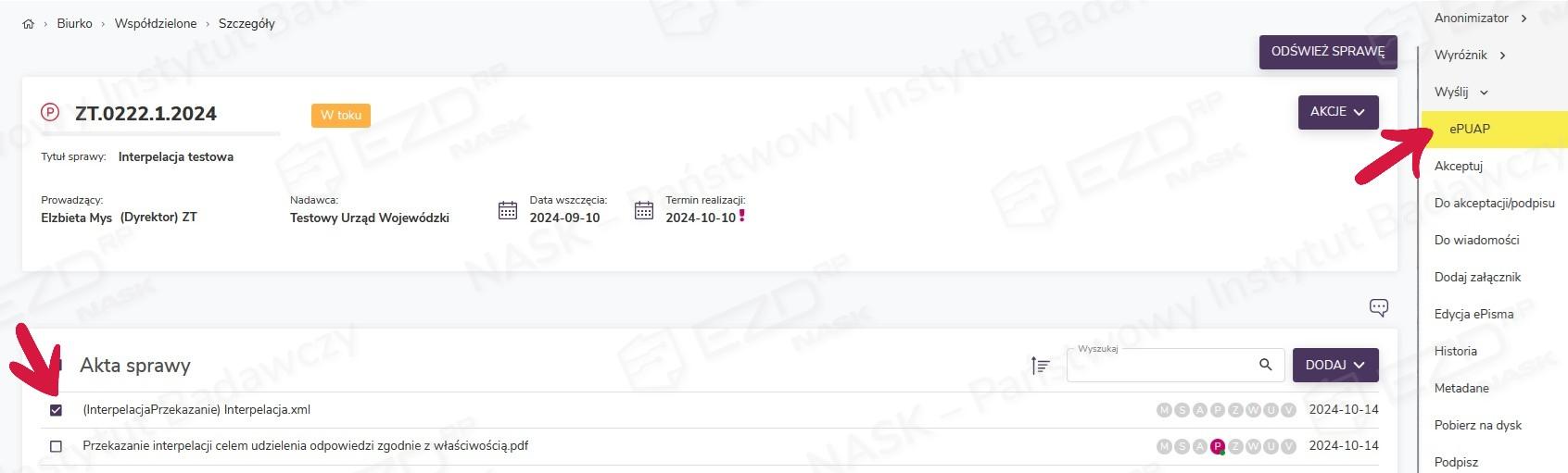 Po zapisaniu utworzona koperta XML z załącznikami do przekazania jest widoczna w Aktach sprawy z dopiskiem w nawiasie InterpelacjaPrzekazanie. Plik po podpisaniu można wysłać, wybierając z menu kontekstowego opcję Wyślij > ePUAP.