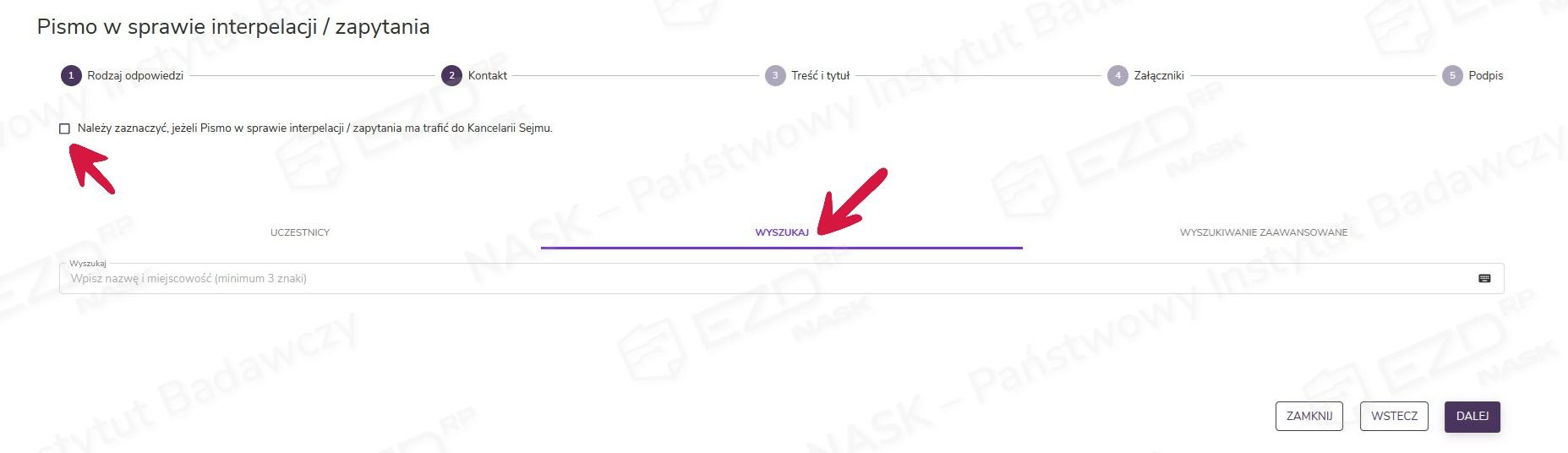 Wybierając jako sposób obsługi interpelacji opcję Pismo w sprawie interpelacji/zapytania, użytkownik może zaznaczyć, że dokument ma zostać przekazany do Kancelarii Sejmu lub pozostawić to pole odznaczone – wtedy możliwe będzie wybranie adresata z Bazy kontaktów.
