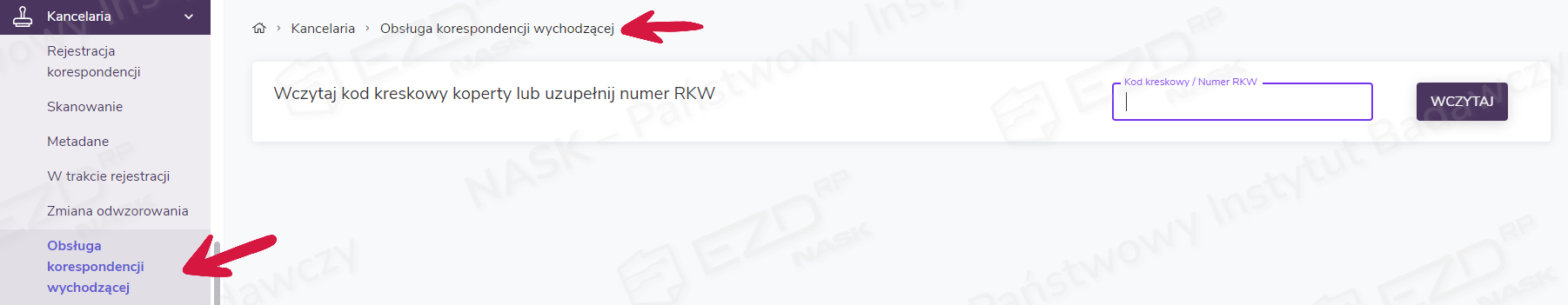 Będąc w tym widoku, należy za pomocą skanera sczytać kod kreskowy z koperty lub w polu Kod kreskowy / Numer RKW ręcznie wprowadzić numer z Rejestru Korespondencji Wychodzącej.