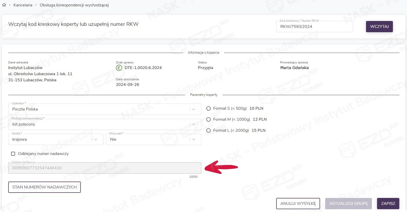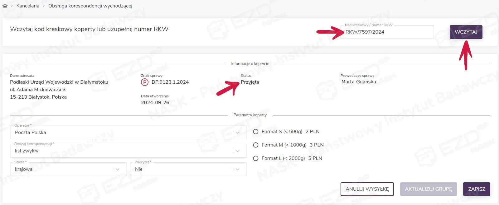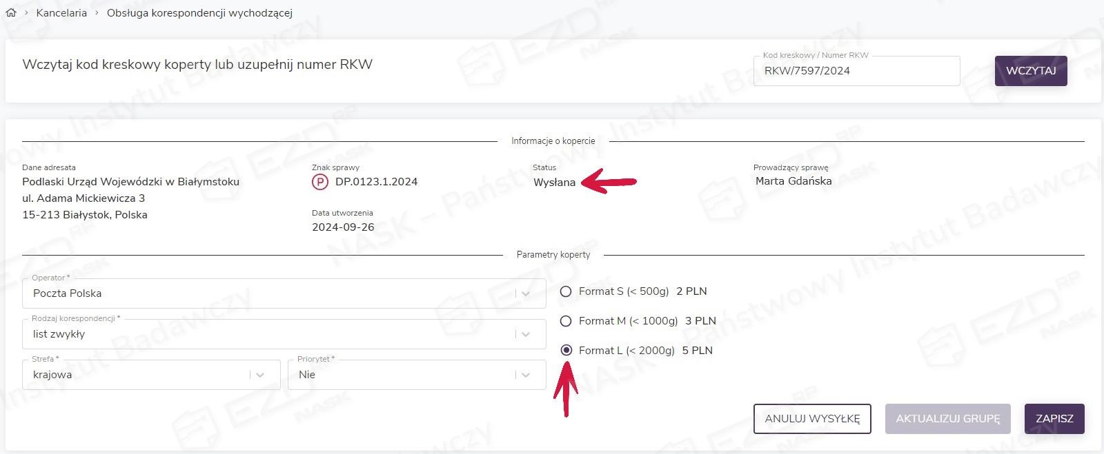 Po określeniu przez pracownika kancelarii formatu koperty i kosztu realizacji przesyłki jej status automatycznie zmieni się na Wysłana.