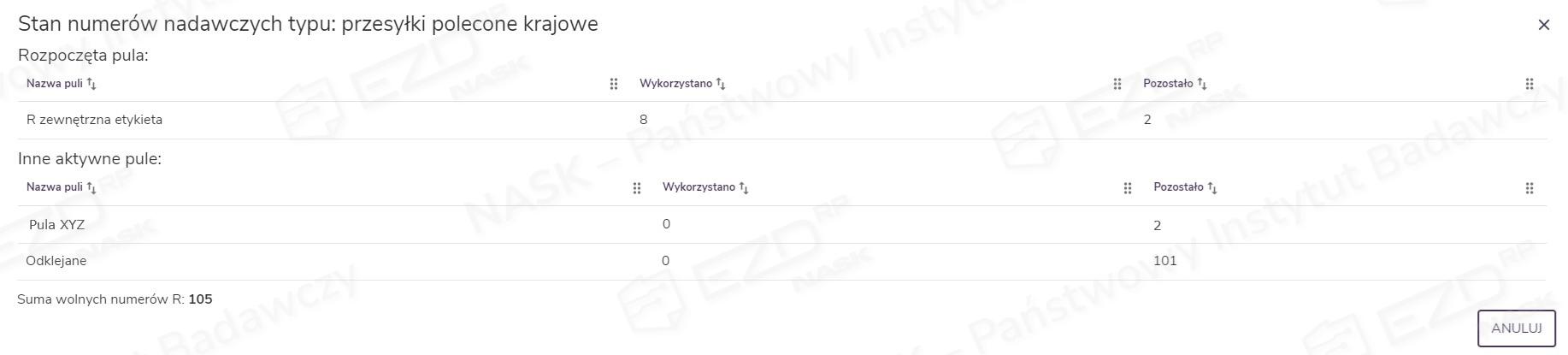 W podsumowaniu znajdują się informacje na temat rozpoczętej w danym momencie puli (jej nazwa, a także liczba numerów wykorzystanych i pozostałych do wykorzystania) oraz te same dane w odniesieniu do innych aktywnych pul.