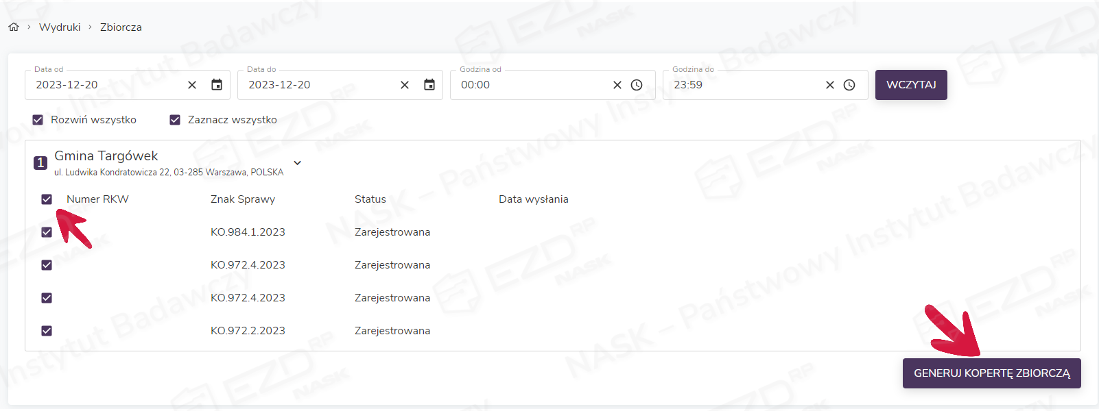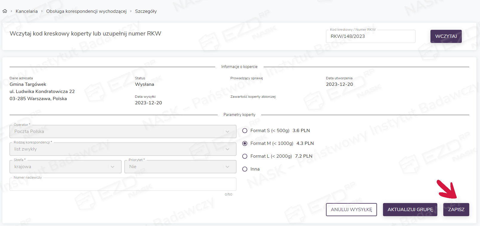 W systemie zostanie odnotowany fakt wysłania korespondencji zbiorczej, a w aktach sprawy nastąpi zmiana statusu wskazanych przesyłek na Wysłane.