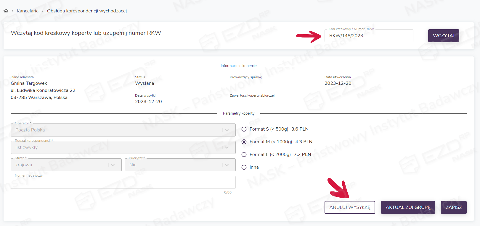 Anulowanie wysyłki koperty zbiorczej możliwe jest w widoku Kancelaria > Obsługa korespondencji wychodzącej. Należy wczytać (lub wpisać) numer RKW koperty oraz wybrać przycisk Anuluj wysyłkę.