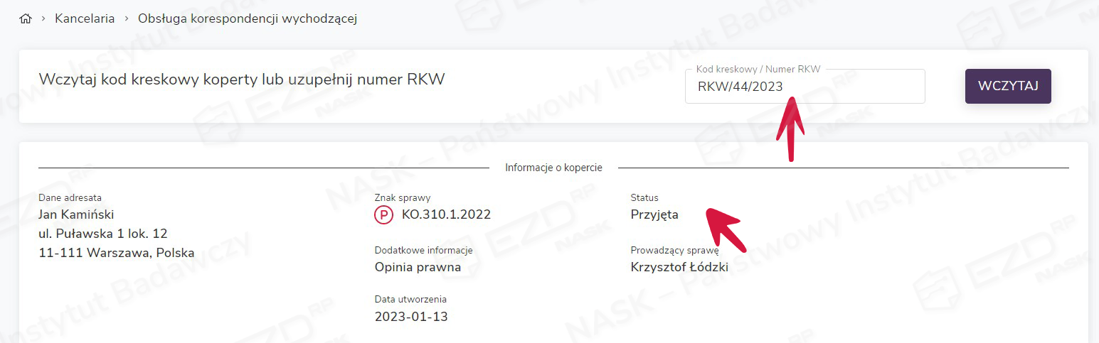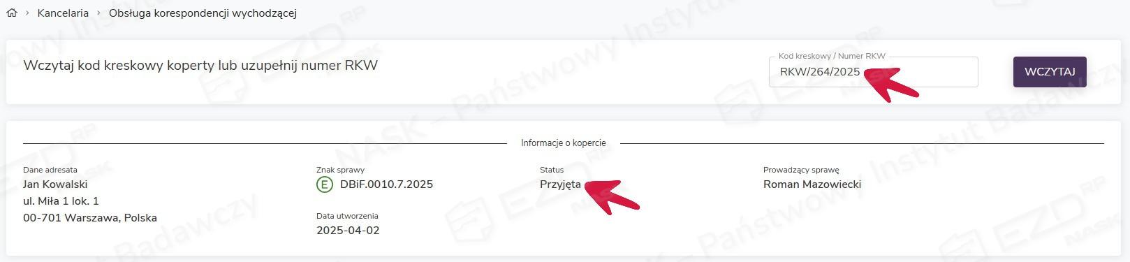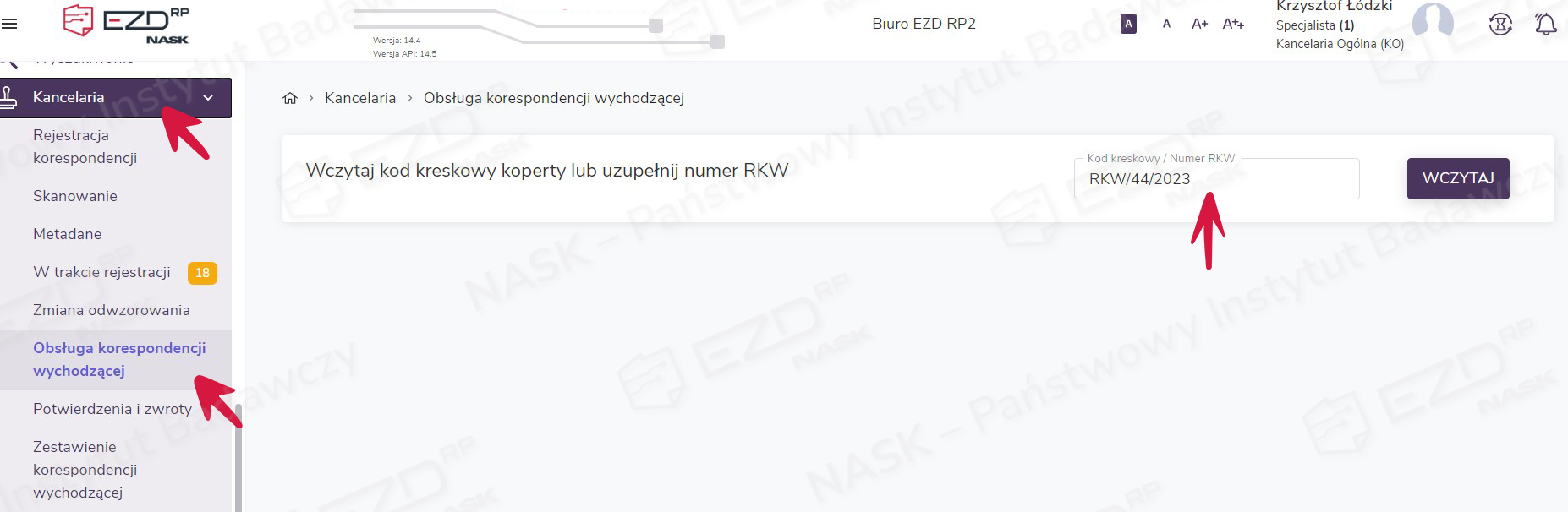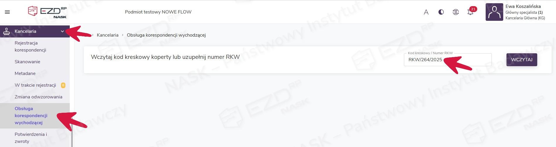 W nowym widoku wczytujemy za pomocą czytnika kodów kreskowych lub wpisujemy w polu Kod kreskowy/Numer RKW numer z rejestru korespondencji wychodzącej, która została zarejestrowana i fizycznie dostarczona do kancelarii przez pracowników merytorycznych.