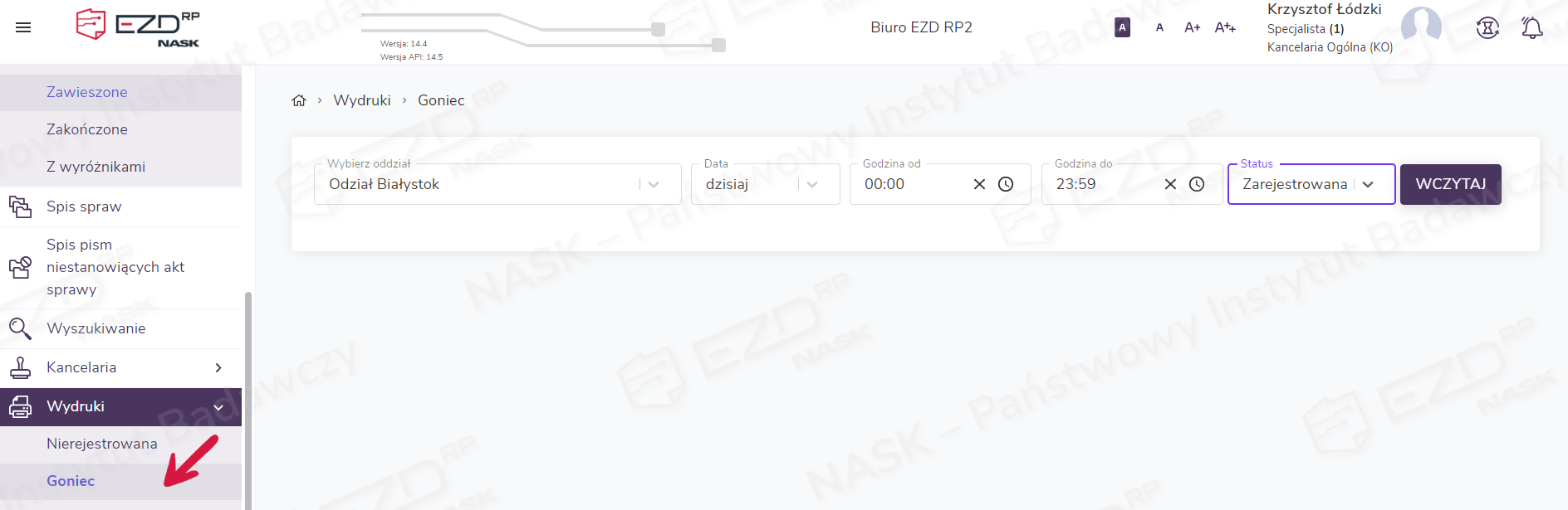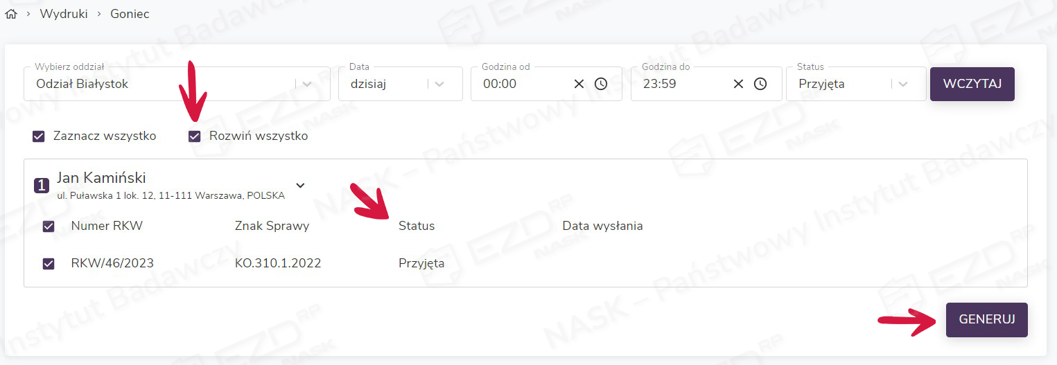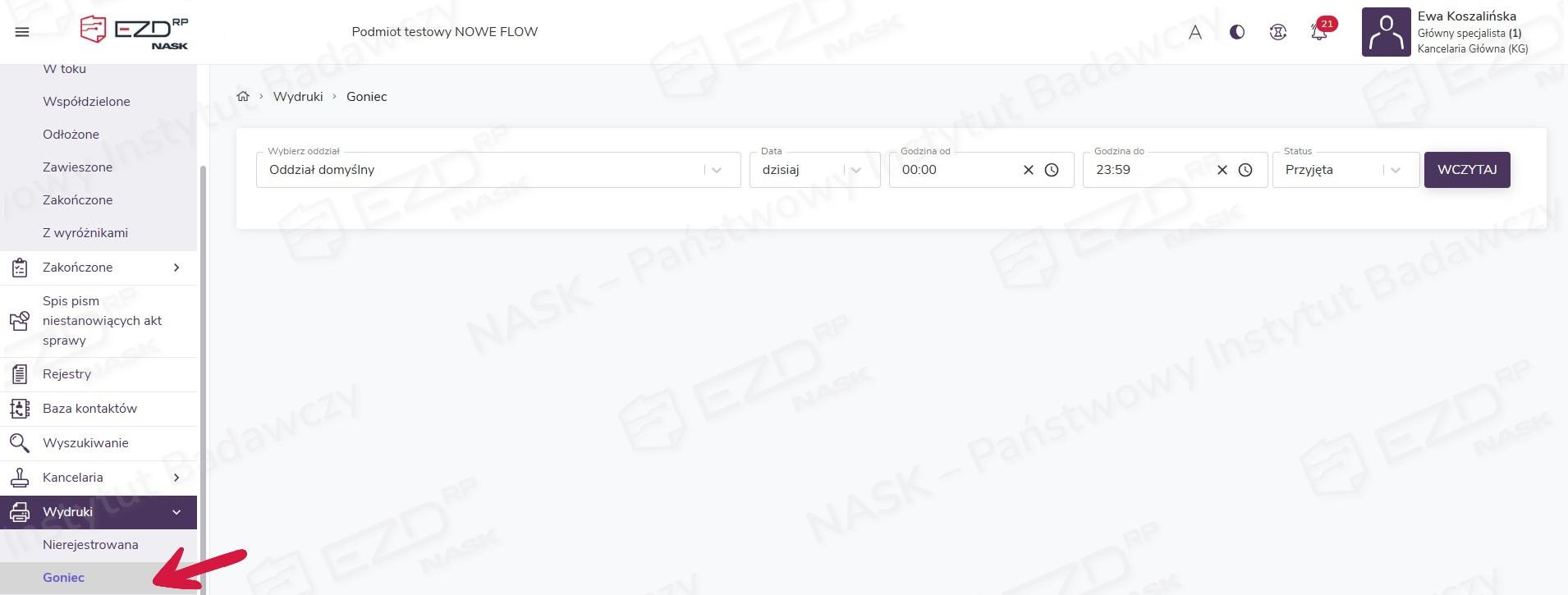 Chcąc wydrukować zestawienie listów, które będą dostarczone do adresatów przez gońca, kierowcę, pracownika instytucji itd., należy w menu głównym kliknąć moduł Wydruki, a następnie sekcję Goniec.