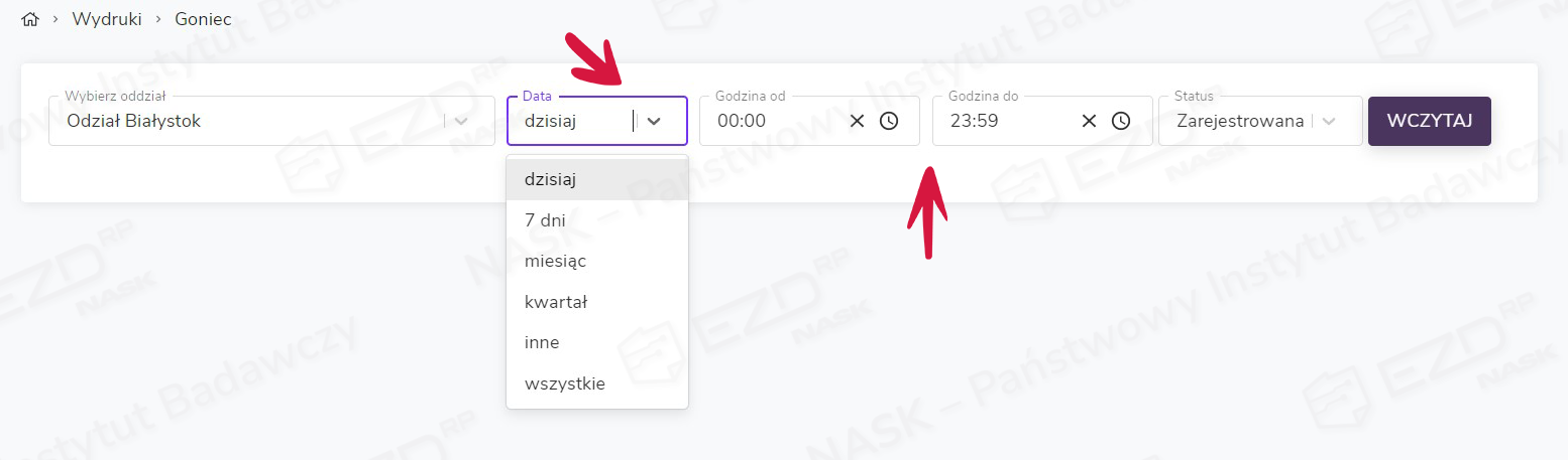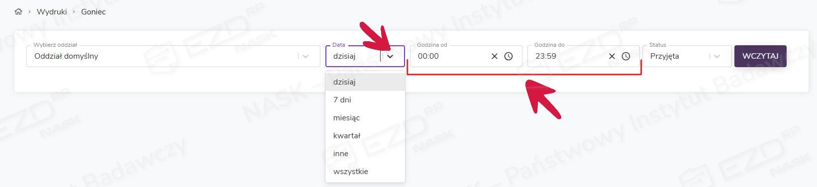 W nowym widoku w polu Data rozwijamy listę i wskazujemy okres, dla którego ma zostać wygenerowany wydruk. Jeśli zostanie wybrana opcja Dzisiaj, widoczne będą również pola pozwalające wskazać zakres godzinowy, jakiego ma dotyczyć wydruk.
