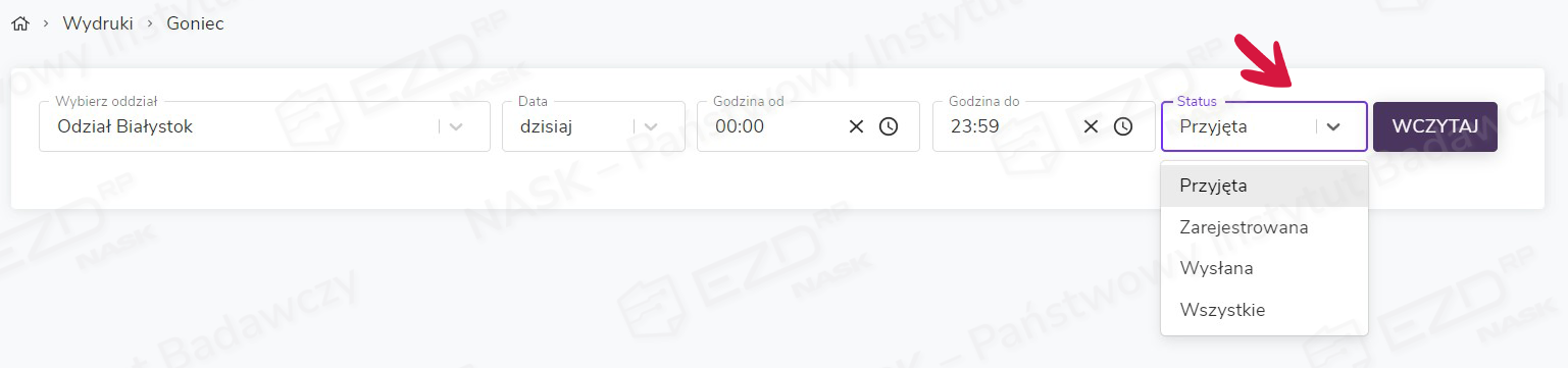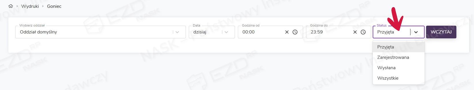 Dla wybranego zakresu generowanego wydruku możemy określić status przesyłki.