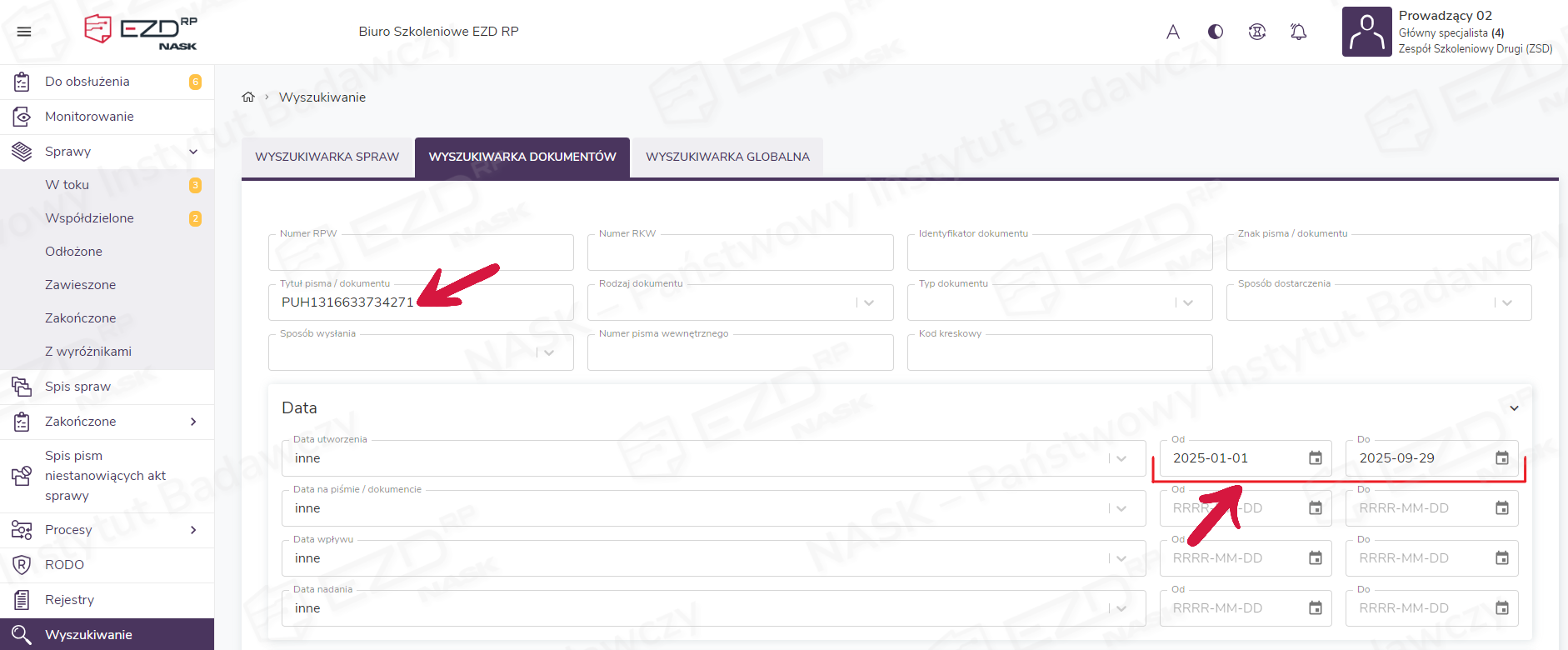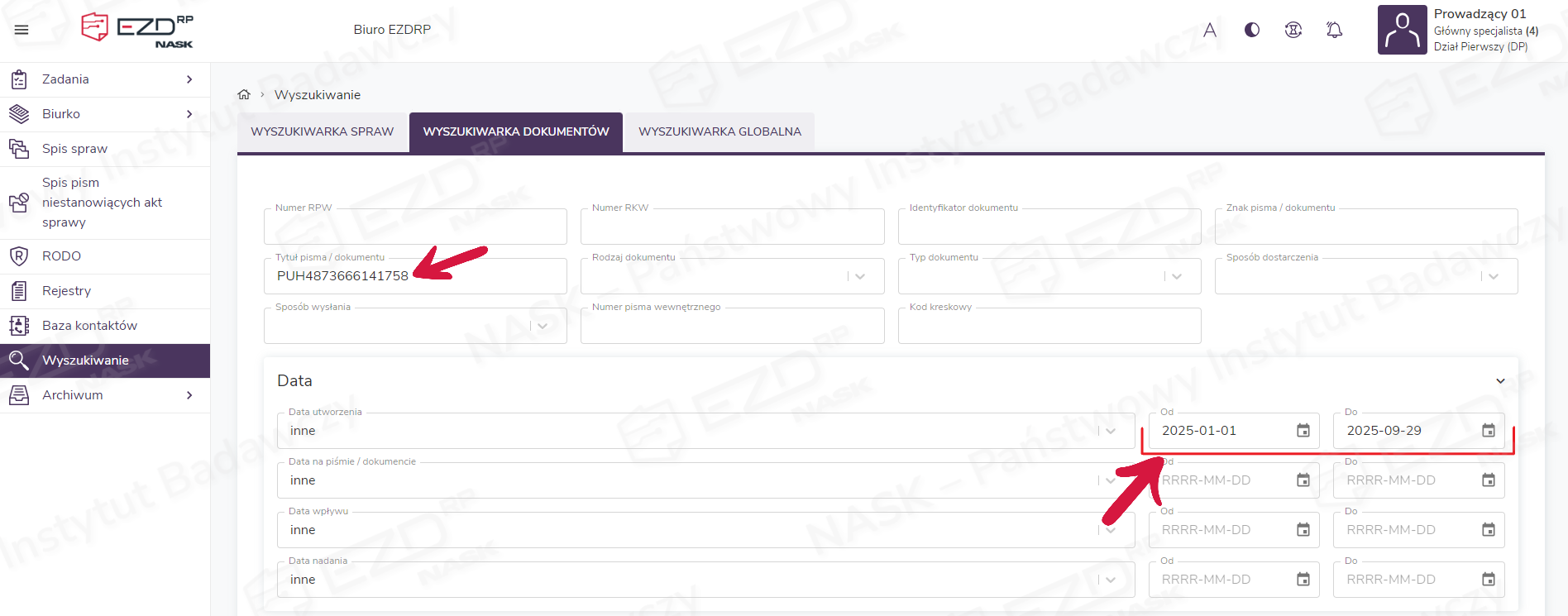 W zakładce Wyszukiwarka dokumentów należy wpisać numer przesyłki PUH w polu wyszukiwania Tytuł pisma/dokumentu oraz dodatkowo wskazać drugie kryterium wyszukiwania, np. datę utworzenia (od 2025-01-01 do bieżącego dnia). Następnie należy rozpocząć wyszukiwanie poprzez klikniecie przycisku Wyszukaj.