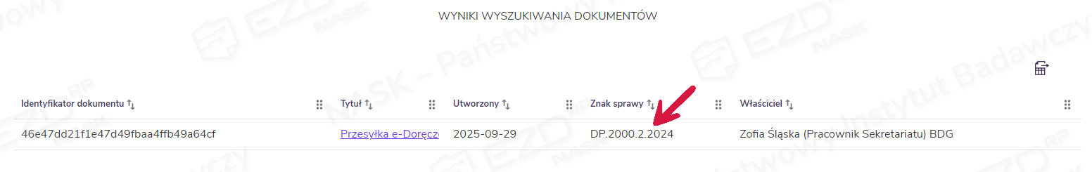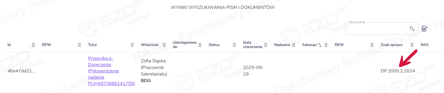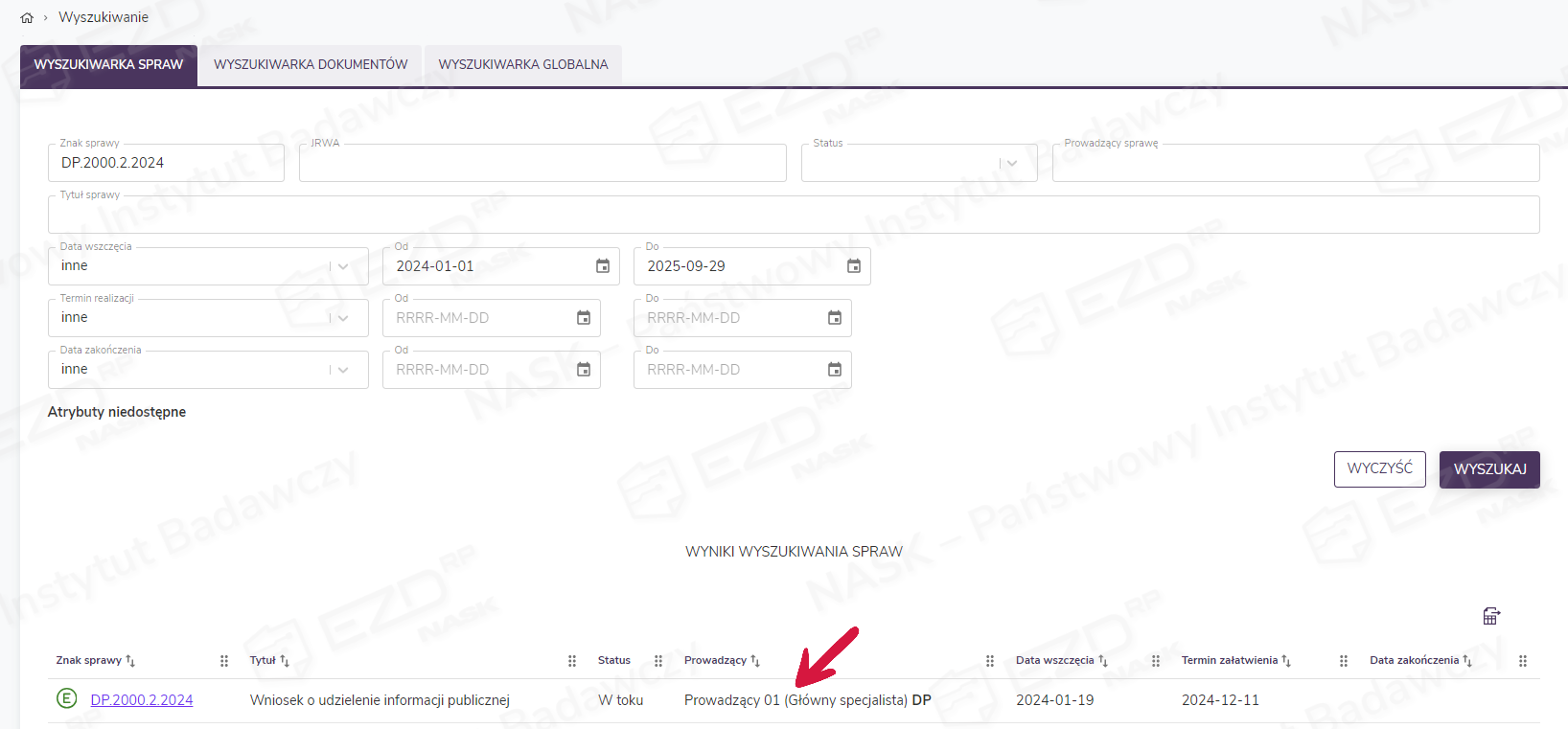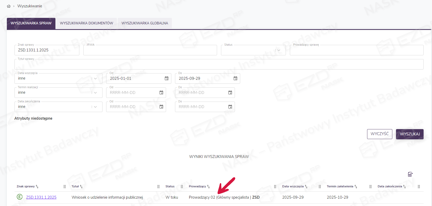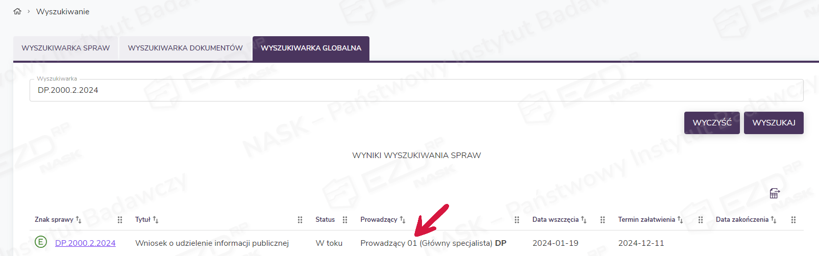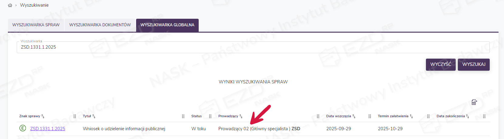 Następnie z pomocą znaku sprawy, z której została zrealizowana wysyłka, należy ustalić jej prowadzącego. Można to zrobić analogicznie poprzez wyszukanie w zakładce Wyszukiwarka spraw lub Wyszukiwarka globalna.