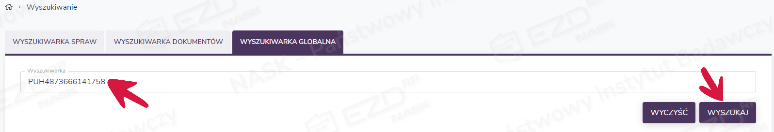 Aby wyszukać sprawę, z której została wysłana korespondencja, należy przejść do modułu Wyszukiwanie, a następnie do zakładki Wyszukiwarka dokumentów lub Wyszukiwarka globalna.