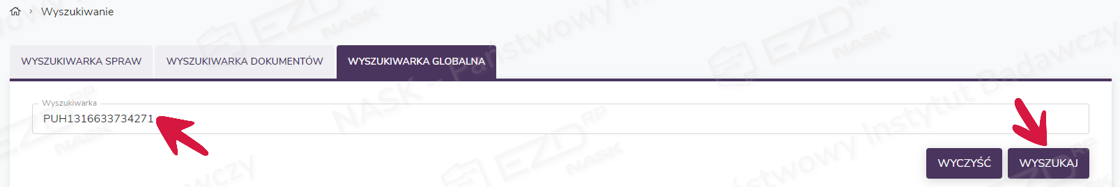 Można skorzystać także z Wyszukiwarki globalnej, gdzie numer przesyłki PUH należy wpisać w polu wyszukiwania.