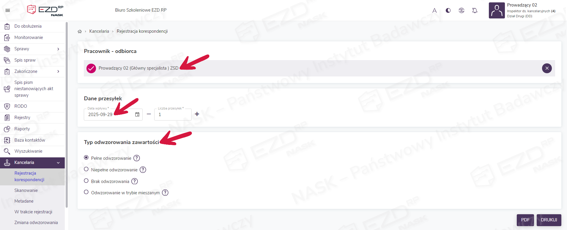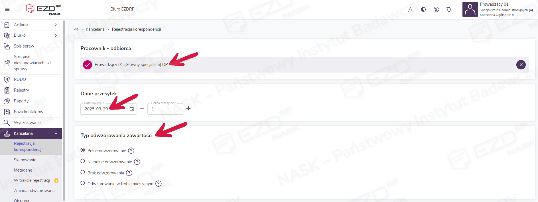 Dalsze kroki rejestracji odbywają się analogicznie jak w przypadku standardowych przesyłek wpływających – jeśli przesyłka podlega odwzorowaniu należy ją zeskanować, a następnie przejść do uzupełnienia metadanych (więcej informacji na ten temat w artykule pt. Uzupełnianie metadanych przesyłek wpływających).