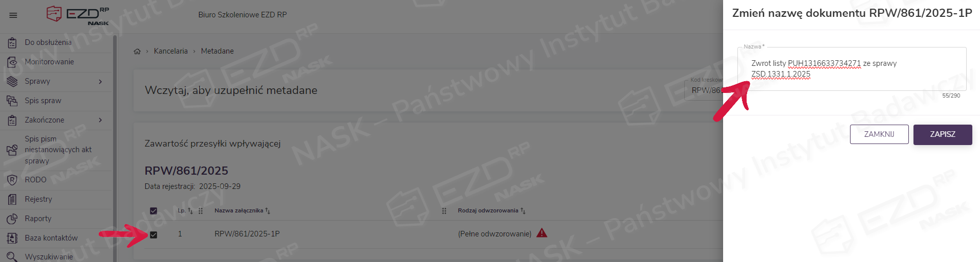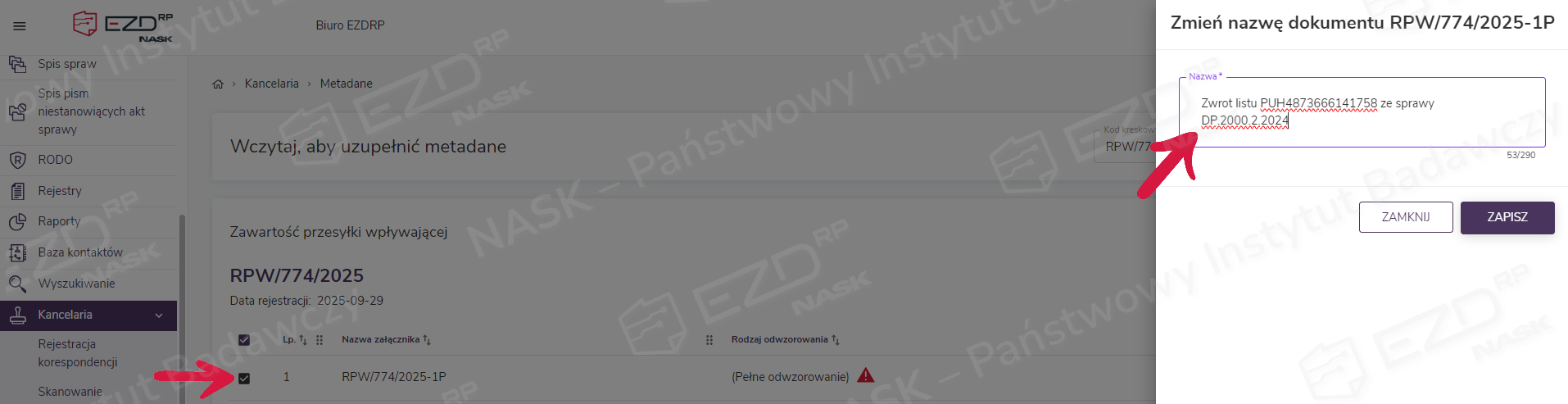 Zarejestrowana przesyłka otrzymuje tytuł załącznika. Aby go zmienić, należy zaznaczyć pole wyboru przy załączniku i z prawego menu wybrać opcję Zmień nazwę. Rekomendujemy wpisanie w tytule przesyłki numeru zwróconej przesyłki PUH i wyszukanego znaku sprawy, z której korespondencja została wygenerowana. Pozwoli to pracownikowi – odbiorcy w szybki sposób dołączyć zwrot listu PUH do sprawy.
