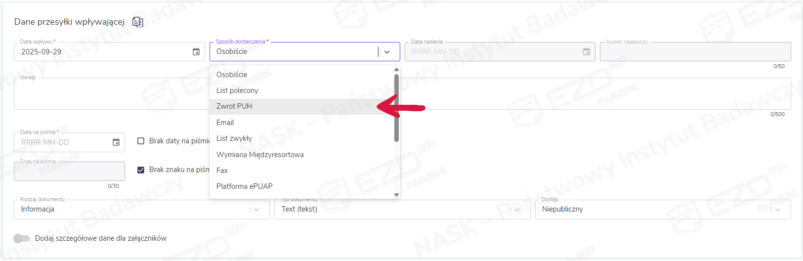 W kolejnej sekcji należy uzupełnić dane przesyłki wpływającej. Jedną z metadanych, którą należy określić, jest sposób dostarczenia. Wartość można wybrać spośród pozycji z rozwijanej listy.