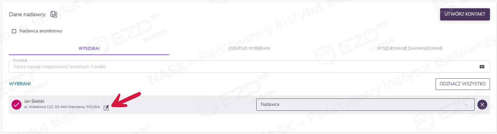 W sekcji Dane nadawcy należy wskazać kontakt adresata, do którego kierowana była korespondencja.