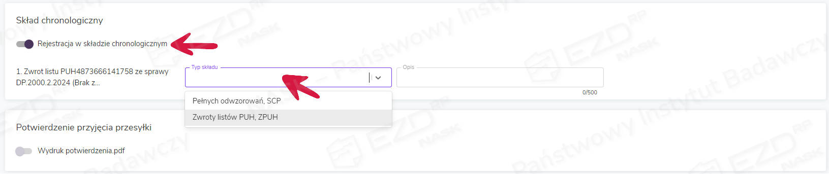 Jeżeli otrzymany zwrot listu PUH stanowi element sprawy elektronicznej, należy zarejestrować go w odpowiednim składzie chronologicznym. W tym celu należy włączyć opcję Rejestracja w składzie chronologicznym, klikając znajdujący się przy niej suwak. Następnie należy wskazać typ składu, wybierając odpowiednią pozycję z listy rozwijanej.