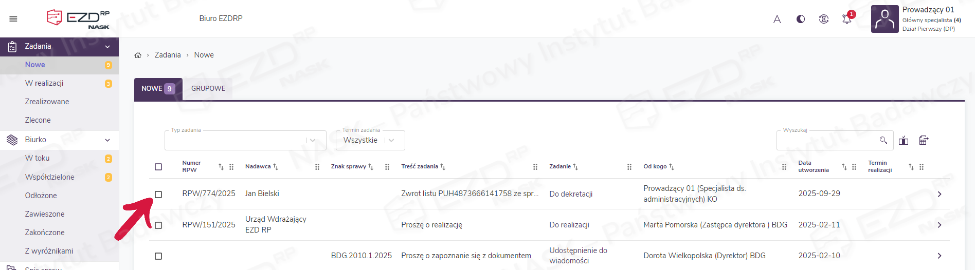 Po zarejestrowaniu przez pracownika kancelarii zwrotu listu PUH pracownik – odbiorca otrzyma nowe zadanie na swoim koncie użytkownika w module Zadania > Nowe.
