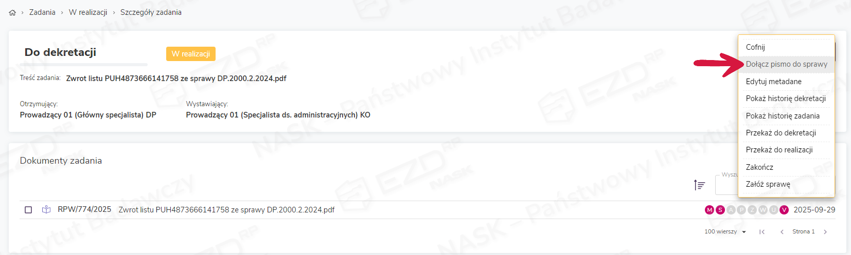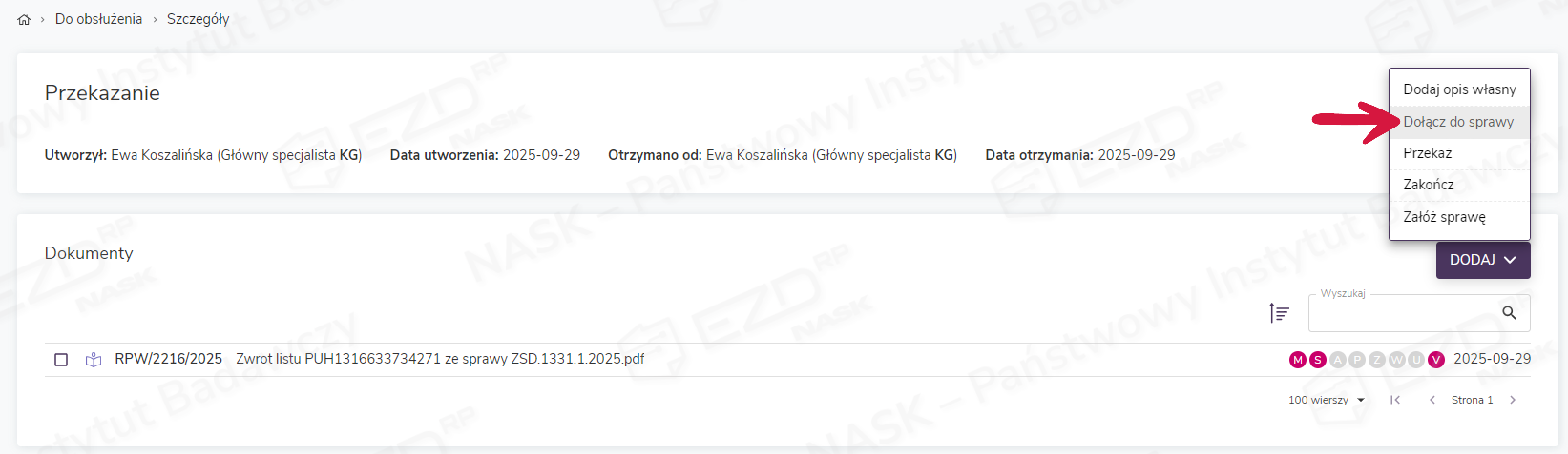 Kolejnym krokiem jest dołączenie zwrotu listu PUH do Akt sprawy, z której została zarejestrowana korespondencja. Aby to zrobić, należy po przejściu do szczegółów zadania wybrać przycisk Akcje, a następnie opcję Dołącz pismo do sprawy. Następnie trzeba wskazać odpowiednią sprawę i zatwierdzić wybór, klikając Dołącz.