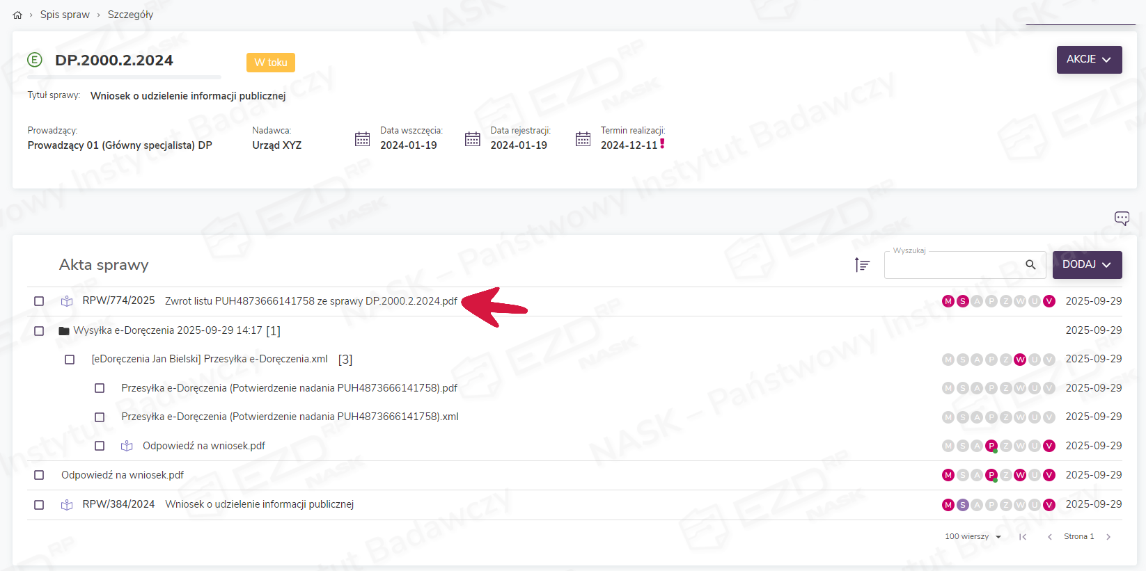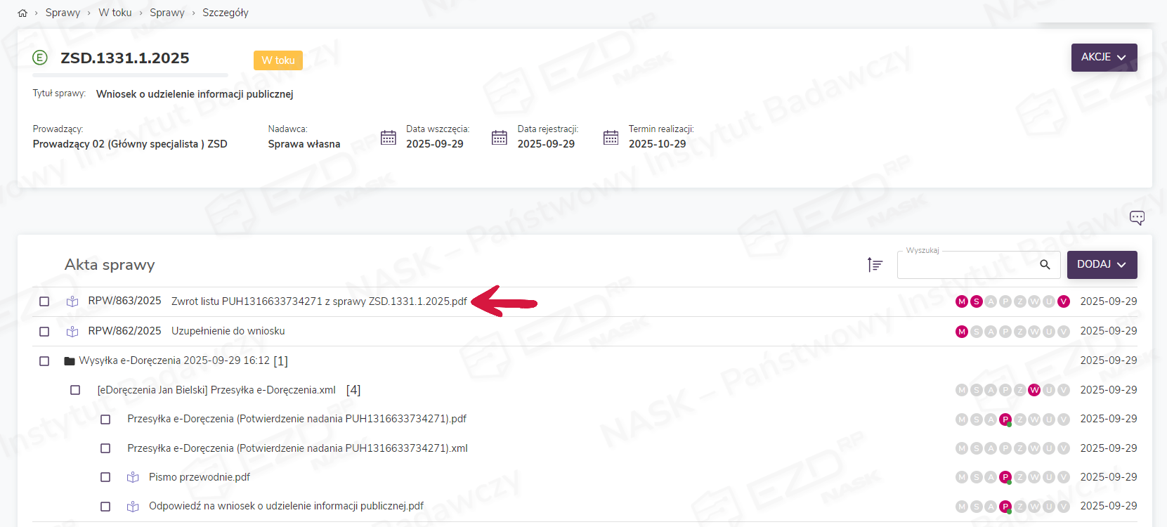 Zwrot listu PUH zostanie dołączony do Akt sprawy jako nowy dokument wpływający – dzięki temu w aktach znajdzie się komplet informacji o wysyłce korespondencji oraz jej zwrocie.
