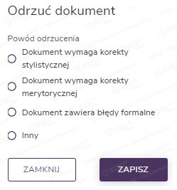 W sytuacji, gdy odbiorca po zapoznaniu się z treścią przesłanego dokumentu lub dokumentów ma do niego, lub do nich uwagi, może odrzucić dokument i nie wykonać zadania. W tym celu po musi przejść do sekcji Moje zadania > Nowe i po wybraniu zadania z listy lub po przejściu do widoku szczegółów zadania, zaznaczyć dokument i z prawego menu wybrać opcję Odrzuć. Następnie w panelu, który pojawi się z prawej strony ekranu, należy wskazać powód odrzucenia i zatwierdzić operację za pomocą przycisku Zapisz.