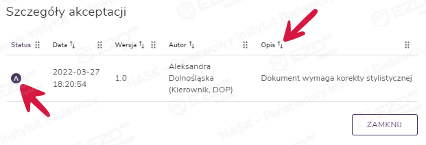 Po kliknięciu ikony z literą A pokaże się panel Szczegóły akceptacji, w którym widoczna będzie informacja o powodzie odrzucenia.