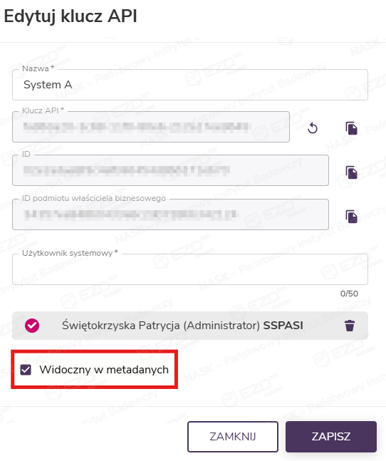 - Wartość – identyfikator klucza API. Na podstawie tej wartości systemy zintegrowane rozpoznają metadane oznaczone jako przeznaczone do integracji.
