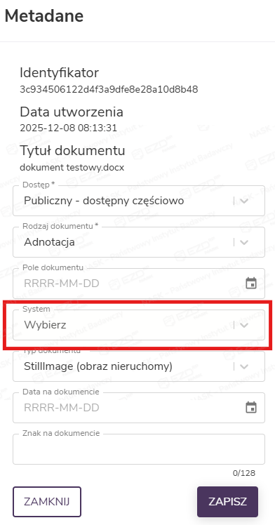 Przechodzimy do metadanych dokumentu. W naszym przypadku atrybut z nazwami systemów zintegrowanych ma nazwę System.