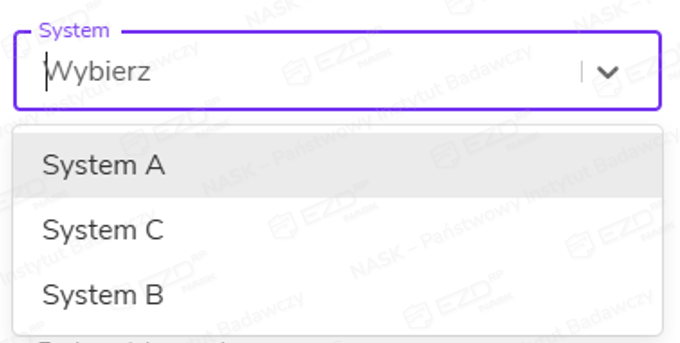 Po rozwinięciu listy będą na niej widoczne nazwy systemów, których klucze api wcześniej oznaczyliśmy jako widoczne w metadanych.